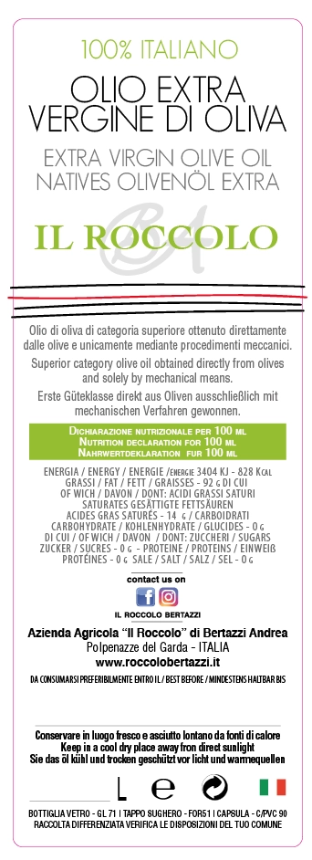 Olio Extra Vergine Oliva Roccolo 100% Italiano 75 cl