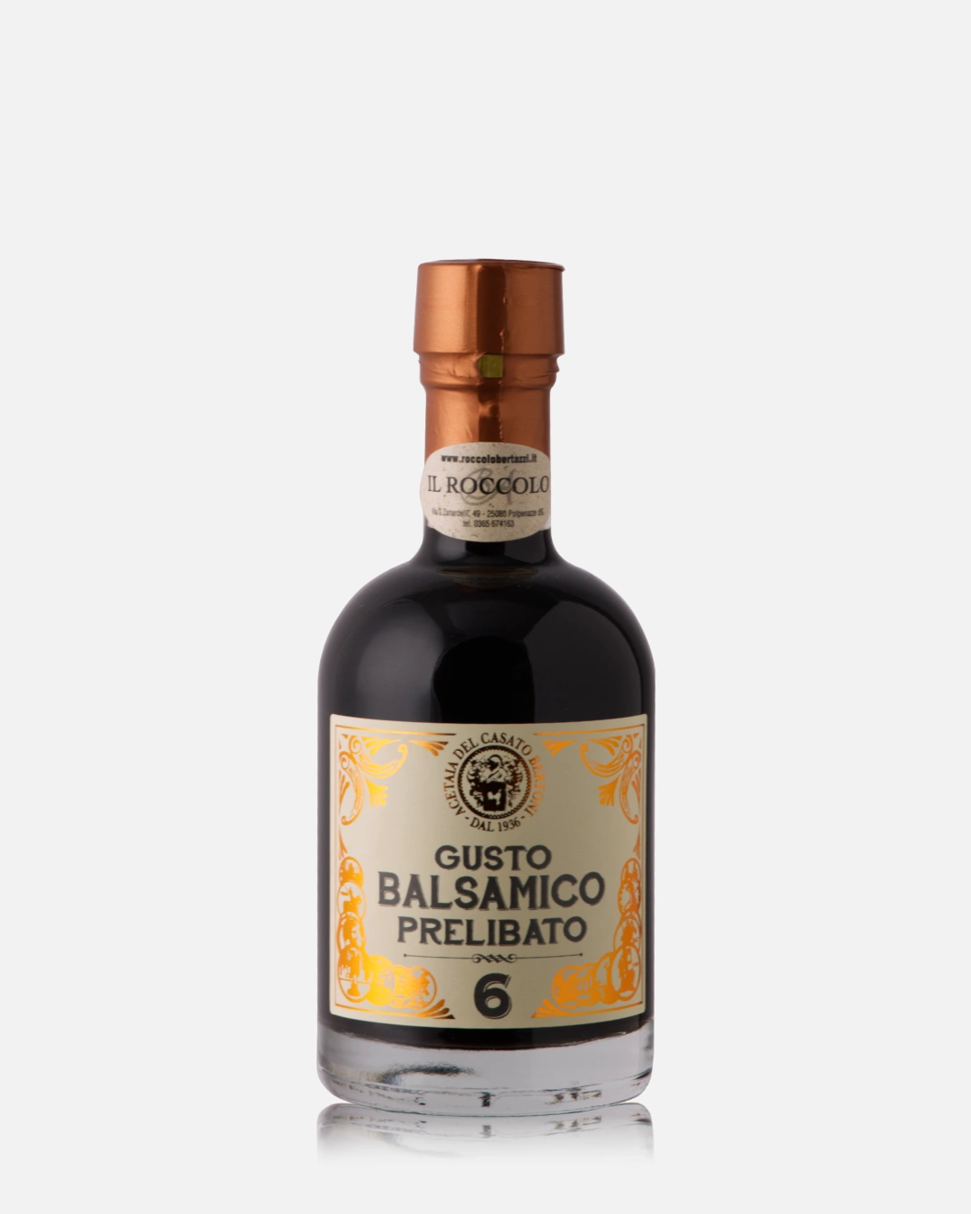 La consistenza di questo aceto balsamico è liquida, profumo aromatico, gusto acidulo e agrodolce.